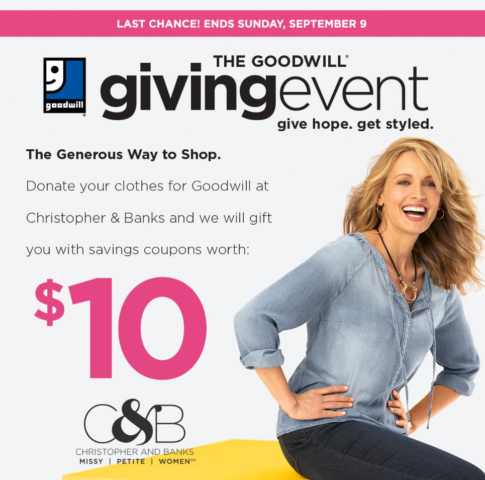 FOR IMMEDIATE RELEASEAugust 29, 2018 Jose Medellin, Director of CommunicationsGoodwill Industries of Greater New York and Northern New Jersey, Inc.Phone: 646-238-9133 | jmedellin@goodwillny.org Monica Dahl, SVP, Chief Marketing Officer, Omni-Channel & PRChristopher & BanksPhone: 763-551-5016 | mdahl@christopherandbanks.com GOODWILL NYNJ PARTNERS WITH CHRISTOPHER & BANKS FOR NATIONWIDE CHARITABLE EVENT National retailer will provide